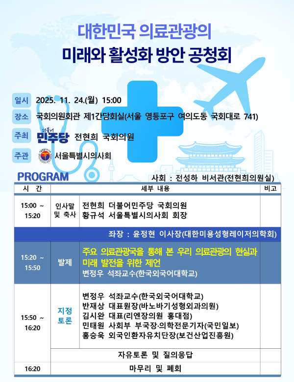 À̹ø °øÃ»È¸´Â ±¹³» ÀÇ·á°ü±¤ »ê¾÷ÀÇ °æÀï·Â °È¸¦ À§ÇÑ Á¤Ã¥°ú »ê¾÷°èÀÇ Çù·Â ¹æ¾È µîÀ» ¸ð»öÇϱâ À§ÇØ ¸¶·ÃµÆ´Ù. ´õºÒ¾î¹ÎÁÖ´ç ÀüÇöÈñ ±¹È¸ÀÇ¿ø½ÇÀÌ ÁÖÃÖÇϰí, ¼¿ïƯº°½ÃÀÇ»çȸ°¡ ÁÖ°üÇÏ´Â Çà»ç´Ù.