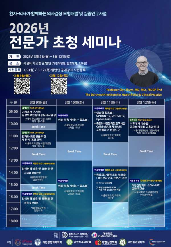 °ø°³°Á´ °øÀ¯ÀÇ»ç°áÁ¤ ºÐ¾ßÀÇ ¼¼°èÀû ¼®ÇÐÀÎ ´ÙÆ®¸Ó½º ´ëÇб³(Dartmouth College) ±Û¸° ¿¤¸°(Glyn Elwyn, MD, PhD) ±³¼ö°¡ ÃÊûµÅ, 3¿ù 9Àϰú 12ÀÏ ÀÌÆ²¿¡ °ÉÃÄ °øÀ¯ÀÇ»ç°áÁ¤ÀÇ ÀÌ·ÐÀû ¸ðÇü°ú ±¹³» ÀÇ·á ÇöÀå Àû¿ëÀ» À§ÇÑ ÁÖ¿ä ÀïÁ¡°ú °úÁ¦¸¦ ÁýÁßÀûÀ¸·Î ¼Ò°³ÇÑ´Ù.