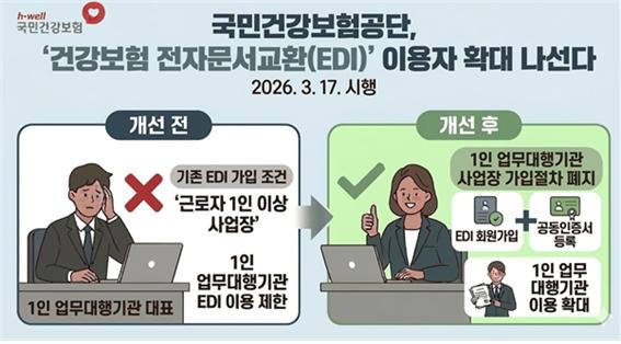 ±¹¹Î°Ç°º¸Çè°ø´Ü(ÀÌ»çÀå Á¤±â¼®)Àº °Ç°º¸Çè ÀüÀÚ¹®¼±³È¯(EDI) ÀÌ¿ë ´ë»óÀ» È®´ëÇÏ¿© 1ÀÎ ¾÷¹«´ëÇà±â°üµµ °Ç°º¸Çè ½Å°í ¾÷¹«¸¦ ó¸®ÇÒ ¼ö ÀÖµµ·Ï ½Ã½ºÅÛÀ» °³¼±Çϰí, 17ÀϺÎÅÍ ¼ºñ½º¸¦ º»°Ý ½ÃÇàÇÑ´Ù°í ¹àÇû´Ù.