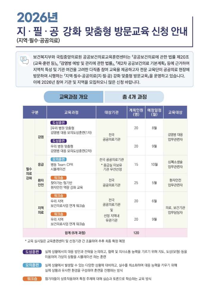 ±¹¸³Áß¾ÓÀÇ·á¿ø(¿øÀå ¼±æÁØ) °ø°øº¸°ÇÀÇ·á±³À°ÈƷü¾ÅÍ´Â Áö¿ª ¿Ï°áÀû º¸°ÇÀÇ·áü°è ±¸ÃàÀ» À§ÇØ Àü±¹ °ø°øÀÇ·á±â°üÀ» ´ë»óÀ¸·Î °¨¿°, ÀÀ±Þ, ȯÀÚ¾ÈÀü, Áö¿ªÀÇ·á ºÐ¾ß¿¡ ´ëÇÑ ¡®2026³â Áö¿ª¡¤Çʼö¡¤°ø°øÀÇ·á(Áö¡¤ÇÊ¡¤°ø) ¸ÂÃãÇü ¹æ¹®±³À°¡¯ Âü¿© Èñ¸Á±â°üÀ» ¸ðÁýÇÑ´Ù°í 20ÀÏ ¹àÇû´Ù. ¸ðÁý±â°£Àº ¿À´Â 4¿ù 3ÀϱîÁö´Ù.