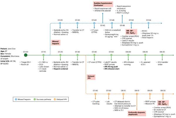 ¡ã ½Ã°£¿¡ µû¸¥ µ¿Àû ȯÀÚ »óÅ º¯È. ÀÇ·á AIÀÇ °³ÀÔ ½ÃÁ¡¿¡ µû¶ó ÁßÁõ ȯÀÚÀÇ ¿¹Èİ¡ ¼¼ °¡Áö °æ·Î(ÃÊ·Ï»ö: ¾ÈÁ¤È, ÆÄ¶õ»ö ¹× ÁÖȲ»ö: »óÅ ¾ÇÈ)·Î °¥¶óÁö´Â ÆÄ±Þ È¿°ú ½Ã¹Ä·¹À̼Ç