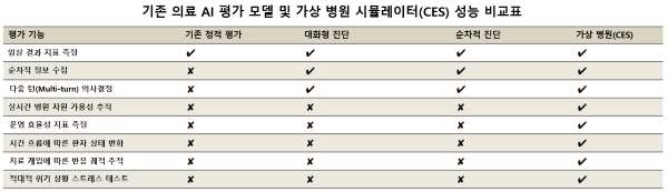 ¡ã ±âÁ¸ ÀÇ·á AI Æò°¡ ¸ðµ¨°ú °¡»ó º´¿ø ½Ã¹Ä·¹ÀÌÅÍ(CES)ÀÇ ¼º´É ºñ±³. CES´Â ±âÁ¸ ¹æ½ÄÀ» È®ÀåÇØ ¡ã½Ã°£¿¡ µû¸¥ ȯÀÚ »óÅ º¯È ¡ã½Ç½Ã°£ º´¿ø ÀÚ¿ø ÃßÀû ¡ãÀ§±â »óȲ ½ºÆ®·¹½º Å×½ºÆ®¶ó´Â ¼¼ °¡Áö ÇÙ½É Â÷¿øÀ» ¸ðµÎ ÃæÁ·ÇÏ´Â À¯ÀÏÇÑ Æò°¡ ü°è´Ù.