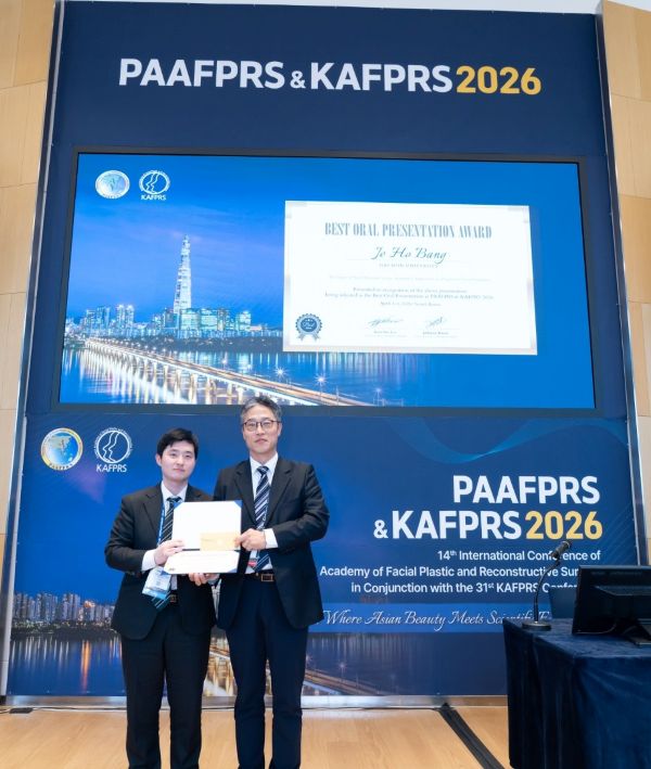 °¡Ãµ´ë ±æº´¿ø(º´¿øÀå ±è¿ì°æ) À̺ñÀÎÈİú ¹æÁ¦È£ ±³¼ö°¡ ÃÖ±Ù ´ëÇѾȸ鼺ÇüÀç°ÇÇÐȸ(KAFPRS)¿Í ¾Æ½Ã¾ÆÅÂÆò¾ç¾È¸é¼ºÇüÀç°ÇÇÐȸ(PAAFPRS)°¡ ¼¿ï SKY31¿¡¼ °øµ¿ ÁÖ°ü, °³ÃÖÇÑ ±¹Á¦ÇÐȸ ¡®PAAFPRS & KAFPRS 2026¡¯¿¡¼ ¡®ÃÖ¿ì¼ö ±¸¿¬»ó(Best Oral Presentation Award)¡¯À» ¼ö»óÇß´Ù.