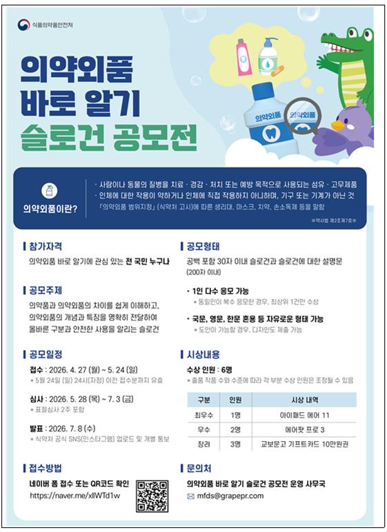À̹ø °ø¸ðÀü ÁÖÁ¦´Â ±¹¹ÎÀÌ ÀǾà¿Üǰ°ú ÀǾàǰÀÇ Â÷À̸¦ ½±°Ô ÀÌÇØÇϰí, ÀǾà¿ÜǰÀÇ °³³ä°ú Ư¡À» ¸íÈ®È÷ Àü´ÞÇÏ¿© ¿Ã¹Ù¸¥ ±¸ºÐ°ú ¾ÈÀüÇÑ »ç¿ëÀ» ¾Ë¸®´Â ³»¿ëÀÌ´Ù.