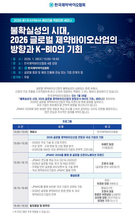 Çѱ¹Á¦¾à¹ÙÀÌ¿ÀÇùȸ(ȸÀå ³ë¿¬È«)´Â ¿À´Â 28ÀÏ ¿ÀÈÄ 3½Ã, Çѱ¹Á¦¾à¹ÙÀÌ¿ÀÇùȸ 4Ãþ °´ç¿¡¼ ¡®ºÒÈ®½Ç¼ºÀÇ ½Ã´ë, 2026 ±Û·Î¹ú Á¦¾à¹ÙÀÌ¿À»ê¾÷ÀÇ ¹æÇâ°ú K-BIOÀÇ ±âȸ¡¯ ¼¼¹Ì³ª¸¦ °³ÃÖÇÑ´Ù°í 22ÀÏ ¹àÇû´Ù.