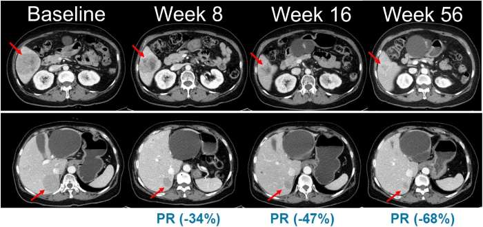 ¡ã NRAS µ¹¿¬º¯ÀÌ Èæ»öÁ¾ ȯÀÚ¸¦ ´ë»óÀ¸·Î ÁøÇàµÈ º§¹Ù¶óÆä´Õ°ú ÄÚºñ¸ÞƼ´Õ º´¿ë¿ä¹ý ÀÓ»ó½ÃÇè¿¡¼ ½Ã°£ °æ°ú¿¡ µû¸¥ º´º¯ º¯È°¡ °üÂûµÈ º¹ºÎ CT ¿µ»ó (Ãâó: ¹Ì±¹ÀÓ»óÁ¾¾çÇÐȸ(ASCO) 2021 ±¸¿¬ ¹ßÇ¥)
