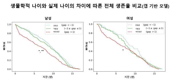 ¡ã »ý¹°ÇÐÀû ³ªÀÌ¿Í ½ÇÁ¦ ³ªÀÌÀÇ Â÷ÀÌ¿¡ µû¸¥ Àüü »ýÁ¸À² ºñ±³(°¸ ±â¹Ý ¸ðµ¨): ³²¼º¿¡¼´Â °Ç°±º ´ëºñ ´Ù¸¥ µÎ ±×·ìÀÇ »ýÁ¸À²ÀÌ À¯ÀÇÇÏ°Ô ³·¾ÒÀ¸¸ç, ¿©¼º¿¡¼µµ ºñ½ÁÇÑ °æÇâÀÌ °üÂûµÊ