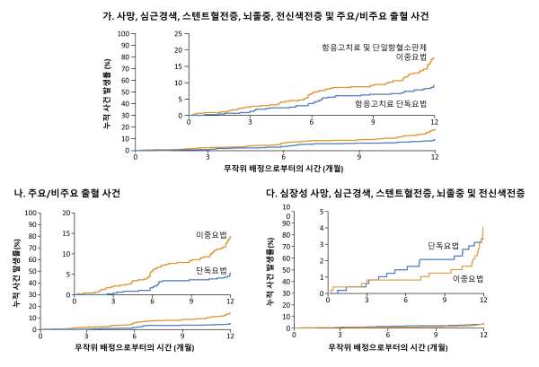 ¡ã ±×¸²¼³¸í: °¡) µî·Ï ÈÄ 1³â°£ »ç¸Á, ½É±Ù°æ»ö, ³úÁ¹Áß, Àü½Å»öÀüÁõ ¹× ÁÖ¿ä/ºñÁÖ¿ä ÃâÇ÷»ç°ÇÀº ´Üµ¶¿ä¹ý±º¿¡¼ 9.6%, ÀÌÁß¿ä¹ý±º¿¡¼ 17.2% ¹ß»ýÇÑ °ÍÀ¸·Î ³ªÅ¸³ª ´Üµ¶¿ä¹ýÀÇ Ä¡·á ¾ÈÀü¼ºÀÌ ´õ ³ôÀº °ÍÀ» È®ÀÎÇß´Ù. ³ª/´Ù) »ç¸Á·ü, ½É±Ù°æ»ö, ½ºÅÙÆ®Ç÷ÀüÁõ, ³úÁ¹Áß ¹× Àü½Å»öÀüÁõ µî ÇãÇ÷¼º »ç°ÇÀº µÎ Áý´Ü °£ À¯ÀǹÌÇÑ Â÷À̰¡ ¾ø¾úÁö¸¸, ÁÖ¿ä ¹× ºñÁÖ¿ä ÃâÇ÷»ç°ÇÀº ´Üµ¶¿ä¹ý±º¿¡¼ °¢°¢ 2.3%, 2.9%, ÀÌÁß¿ä¹ý±º¿¡¼´Â °¢°¢ 6.1%, 7.1% ¹ß»ýÇØ ÀÌÁß¿ä¹ýÀ» ¹ÞÀº ȯÀÚµéÀÌ ´õ ¸¹Àº ÃâÇ÷»ç°ÇÀ» °æÇèÇÑ °ÍÀ¸·Î ³ªÅ¸³µ´Ù.