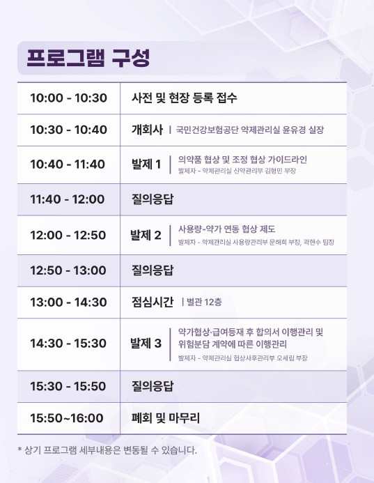 À̹ø ¼³¸íȸ¿¡¼´Â ½Å¾à ¹× Á¶Á¤Çù»ó, »ç¿ë·®-¾à°¡ ¿¬µ¿ Çù»ó, »ç¿ë¹üÀ§ È®´ë Çù»ó ¹× Çù»ó ÀÌÇà°ü¸® ¾÷¹«ÀÇ 2025³âµµ ÃßÁøÇöȲÀ» °øÀ¯Çϰí Á¦µµ °³¼± »çÇ׿¡ ´ëÇÑ Áöħ °³Á¤¿¡ ¾Õ¼ Á¦¾à¾÷°èÀÇ ÀǰßÀ» ¼ö·ÅÇÏ´Â ½Ã°£À» °¡Áú ¿¹Á¤ÀÌ´Ù.