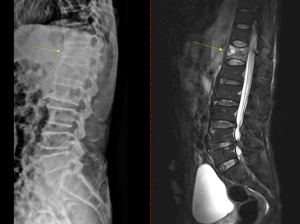¡ã °ñ´Ù°øÁõ¼º ¾Ð¹Ú°ñÀý ȯÀÚÀÇ Ã´Ãß x-ray(¿ÞÂÊ)¿Í MRI(¿À¸¥ÂÊ)