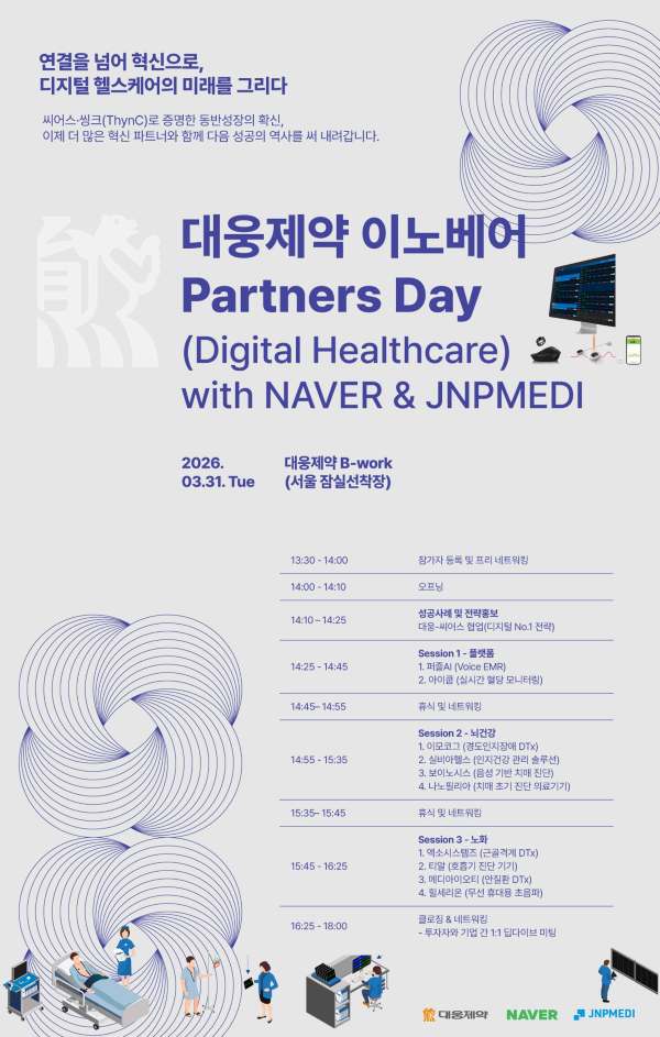 ´ë¿õÁ¦¾àÀº ¿À´Â 31ÀÏ ¼¿ï Àá½Ç ¼±ÂøÀå ¡®ºñ¿öÅ©(B-work)¡¯¿¡¼ ¡®´ë¿õÁ¦¾à À̳뺣¾î Partners Day (Digital Healthcare) with NAVER & JNPMEDI¡¯¸¦ °³ÃÖÇÑ´Ù°í 30ÀÏ ¹àÇû´Ù. À̹ø Çà»ç´Â ´ë¿õÁ¦¾àÀÌ ÁÖÃÖÇÏ°í ³×À̹ö, Á¦À̾ØÇǸ޵ð(JNPMEDI)°¡ °øµ¿ Âü¿©ÇØ 3»ç°¡ ÇÔ²² ¹ß±¼¡¤À°¼ºÇØ ¿Â µðÁöÅÐ ÇコÄÉ¾î Æ÷Æ®Æú¸®¿À ±â¾÷µéÀÇ ¼º°ú¸¦ ¿ÜºÎ ½ÃÀå¿¡ °ø°³ÇÏ´Â ÀÚ¸®´Ù.