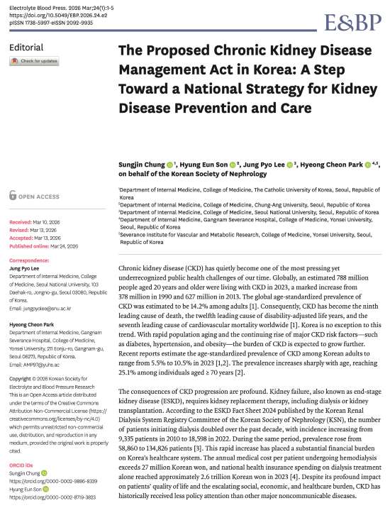 °¡Å縯´ëÇб³ Àǰú´ëÇÐ Á¤¼ºÁø ±³¼ö(´ëÇѽÅÀåÇÐȸ Áø·áÁöħÀÌ»ç)´Â ÃÖ±Ù ±¹Á¦ ÇмúÁöÀÎ ¡®Electrolyte & Blood Pressure(E&BP)¡¯ 3¿ùÈ£¸¦ ÅëÇØ Çѱ¹ ¸¸¼ºÄáÆÏº´ÀÇ ½É°¢ÇÑ ÇöȲÀ» Áø´ÜÇϰí, ±¹È¸¿¡¼ ¹ßÀÇµÈ °ü¸®¹ý¾ÈÀÌ °®´Â Á¤Ã¥Àû °¡Ä¡¿Í ±¹Á¦Àû À§»óÀ» ÁýÁß Á¶¸íÇß´Ù.