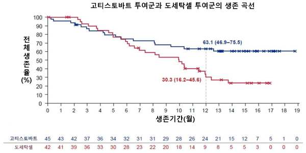 ¡ã Ä¡·á ½ÃÀÛ 6°³¿ù ½ÃÁ¡ºÎÅÍ »ýÁ¸ °î¼±ÀÌ È®¿¬È÷ ¹ú¾îÁö¸ç, 12°³¿ù ½ÃÁ¡¿¡¼´Â °íƼ½ºÅä¹ÙÆ®±ºÀÌ µµ¼¼Å¹¼¿±ºº¸´Ù µÎ¹è ³ôÀº »ýÁ¸À²À» º¸¿©ÁØ´Ù.