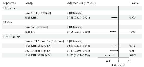 ¡ã »ýȰ½À°ü¿¡ µû¸¥ ¿ì¿ï Áõ»ó ¹ß»ý À§Çè ºñ±³. ½Ä»ç¿Í ¿îµ¿À» ¸ðµÎ ì±âÁö ¾ÊÀº ±×·ìÀÇ ¿ì¿ï Áõ»ó ¹ß»ý À§ÇèÀÌ °¡Àå ÄÇ´ø ¹Ý¸é, µÎ °¡Áö¸¦ ¸ðµÎ °Ç°ÇÏ°Ô ½ÇõÇÑ ±×·ìÀº ±× À§ÇèÀÌ ¾à 45% ´ëÆø °¨¼ÒÇÑ °ÍÀ¸·Î ³ªÅ¸³µ´Ù.