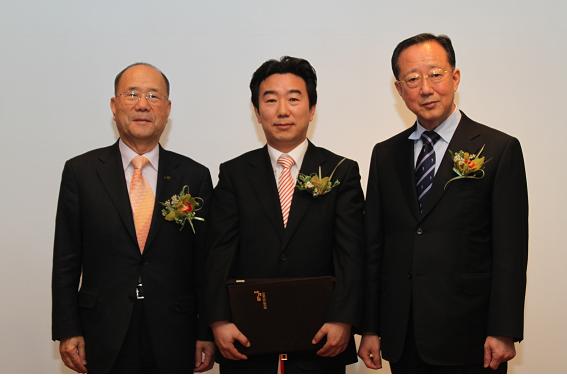 <»çÁø¼³¸í> Á¦ 10ȸ º¸·É¾ÏÇмú»ó ¼ö»óÀÚ·Î ¼±Á¤µÈ ¹ÚÀç¿ë ±³¼ö(°¡¿îµ¥), ±èº´±¹ Çѱ¹¾Ï¿¬±¸Àç´Ü ÀÌ»çÀå(¿À¸¥ÂÊ), ±è½ÂÈ£ º¸·ÉÁ¦¾à±×·ì ȸÀå(¿ÞÂÊ)ÀÌ ½Ã»ó½ÄÀ» ¸¶Ä¡°í ±â³ä»çÁøÀ» Âï°í ÀÖ´Ù.